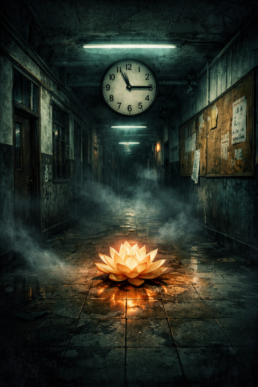 Outside the barred window, an abandoned campus stretches into the dark. A digital clock blinks the same time over and over. And somewhere in the building, something has already started looking for you.